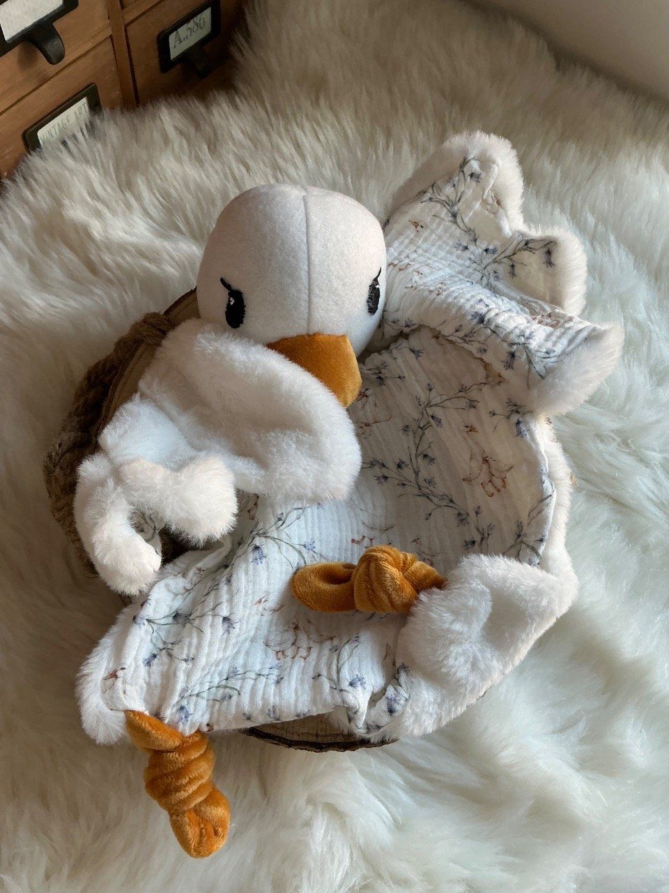 Le doudou oie, un doudou tellement poétique qui saura charmer petit et grand, avec sa douce fourrure blanche, ses délicates ailes et ses petites patounes, il saura accompagner au mieux les nuits de bébé