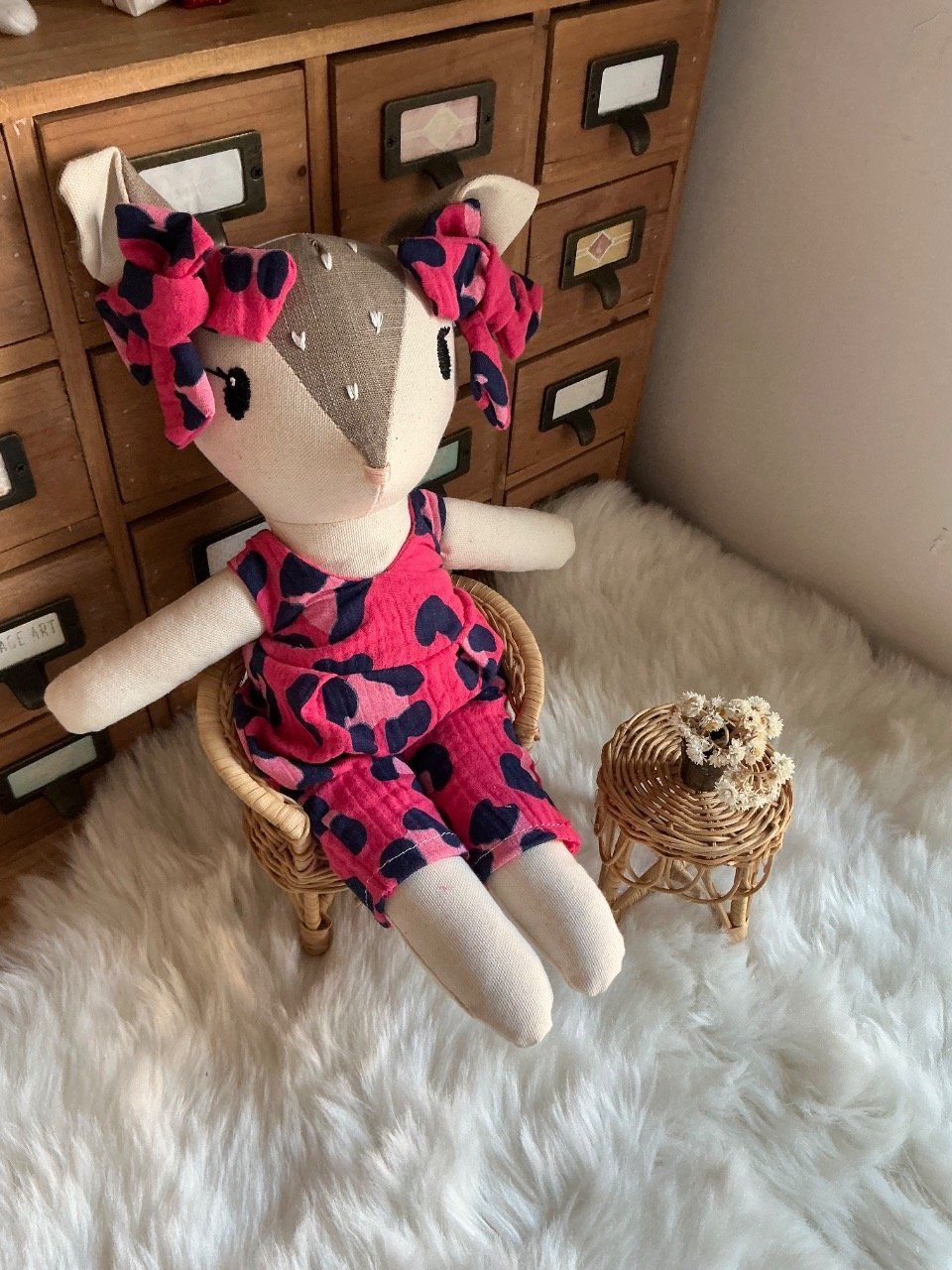 Adorable poupée biche vendue avec sa salopette au motif léopard fuschia et ses deux petites barrettes du même motif! un cadeau unique et original